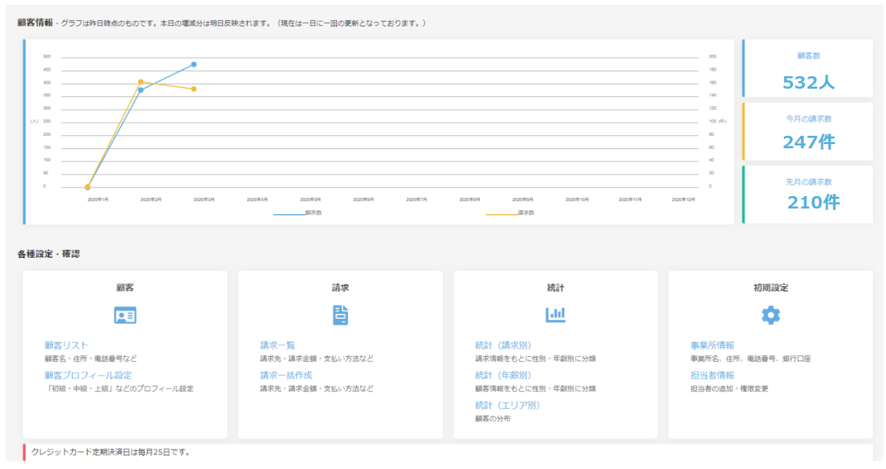 ここでは現在の会員数の他、当月の請求件数、前月の請求件数を表示するので、らくらく顧客管理でメインで行う毎月の請求管理業務を効率化します。